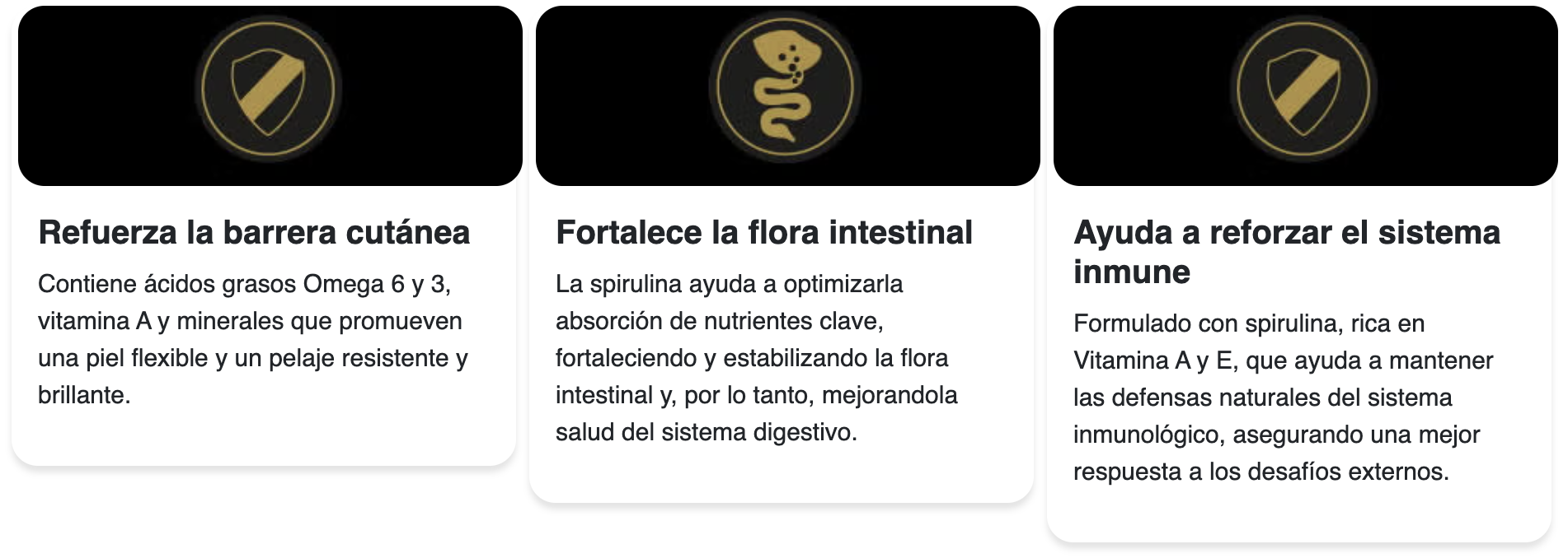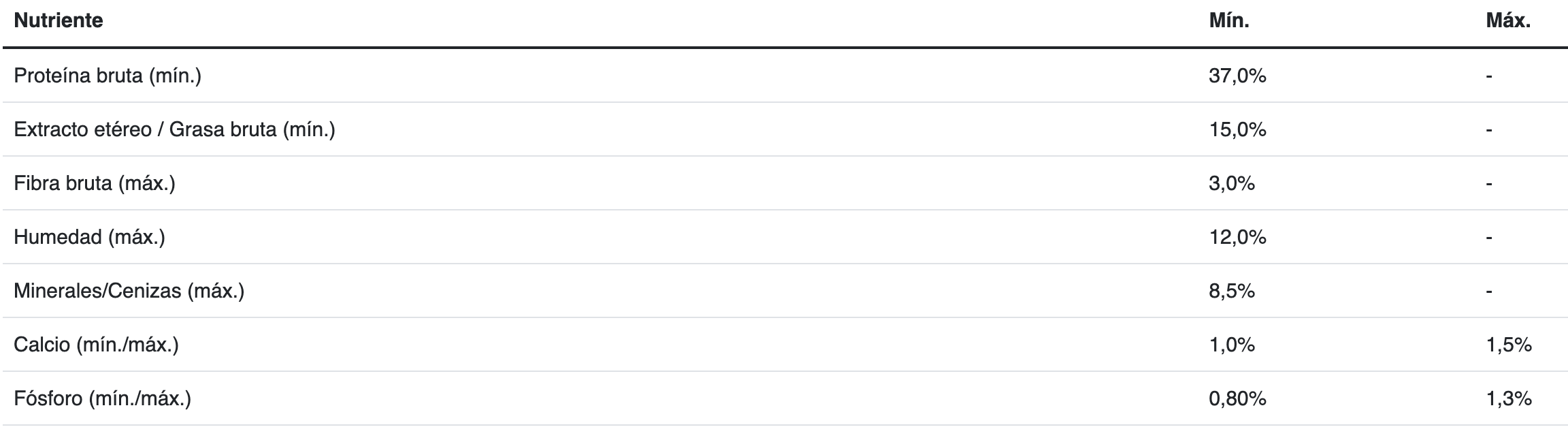 Carne de pollo, gluten de maíz, harina de subproductos de pollo, maiz, trigo, aceite de pollo y/o grasa vacuna preservados con tocoferoles (fuente de vitamina E), aceite de pescado y/o harina de alga (Schizochytrium sp.), hidrolizado a base de subproductos de pollo y/o cerdo, inulina, ácido fosfórico y/o bisulfato de sodio, cloruro de potasio, arroz, gluten de trigo, pulpa de remolacha, carbonato y/o fosfato cálcico, L-arginina, suplemento vitamínico antioxidante (A, D3, E, K3, B1, B2, B3, B5, B6, B7, B9, B12, BHT), sal, L-lisina, cloruro de colina, suplementos minerales [(sulfatos: zinc, hierro, manganeso, cobre), (proteinatos: zinc, hierro, manganeso, cobre, selenio), yodato de calcio, selenito de sodio], beta-caroteno, taurina, DL-metionina, levadura seca (Saccharomyces cerevisiae ssp.), ácido ascórbico (fuente de vitamina C).