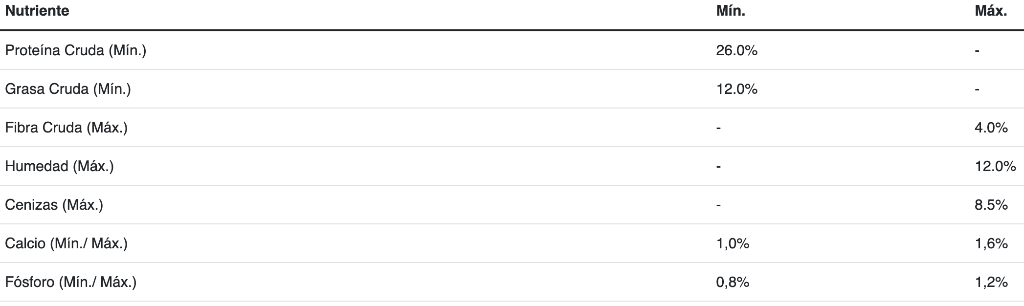 Carne de Pollo, Arroz, Harina de Subproductos de Pollo (fuente natural de Glucosamina), Maíz, Trigo, Harina de Gluten De Maíz, Grasa Vacuna y/o Aceite de Pollo Preservados con Tocoferoles Mezclados (Fuente de Vitamina E), Digesto Animal (A Base de Subproductos de Pollo y/o Porcino), Fibra de Soja y/o Salvado de Maíz, Carbonato de Calcio y/o Fosfato Bicálcico, Sal, Cloruro de Potasio, Huevo en Polvo , Aceite de Pescado, L-Lisina, Spirulina (Arthrospira Platensis), Cloruro de Colina, Suplementos Vitamínicos (A, D3, E, B12), Dl-Metionina, Levadura Seca (Saccharomyces cerevisiae ssp), Sulfato de Zinc, Proteinato de Zinc, Sulfato Ferroso, Sulfato de manganeso, Proteinato de manganeso, Sulfato de cobre, Proteinato de cobre, Iodato de calcio, Selenito de sodio, BHT, Niacina, Pantotenato de calcio, Suplemento de Riboflavina, Mononitrato de tiamina, Ácido fólico, Clorhidrato de piridoxina.
