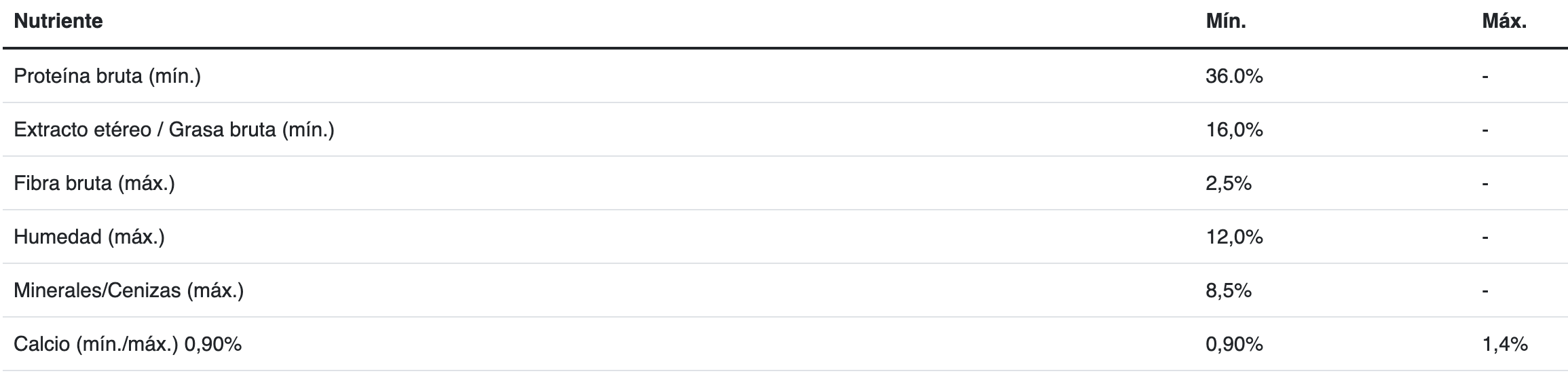 Carne de pavo congelada, maíz, harina de subproductos de pollo, gluten de maíz, arroz, aceite de pollo y/o grasa vacuna preservados con tocoferoles (fuente de vitamina E), trigo, hidrolizado (polvo y/o liquido) a base de subproductos de pollo y/o cerdo, aceite de pescado, inulina, sal, harina de pescado y/o harina de alga (Schizochytrium sp.), cloruro de potasio, gluten de trigo, ácido fosfórico y/o bisulfato de sodio, carbonato cálcico y/o fosfato cálcico, L-lisina, pirofosfato tetrasódico, suplemento vitamínico antioxidante (A, D3, E, K3, B1, B2, B3, B5, B6, B7, B9, B12, BHT), cloruro de colina, suplementos minerales [(sulfatos: zinc, hierro, manganeso, cobre), (proteinatos: zinc, hierro, manganeso, cobre, selenio), yodato de calcio, selenito de sodio], taurina, levadura seca (Saccharomyces cerevisiae ssp.), ácido ascórbico (fuente de vitamina C), probiótico (Bacillus coagulans), DL-metionina.