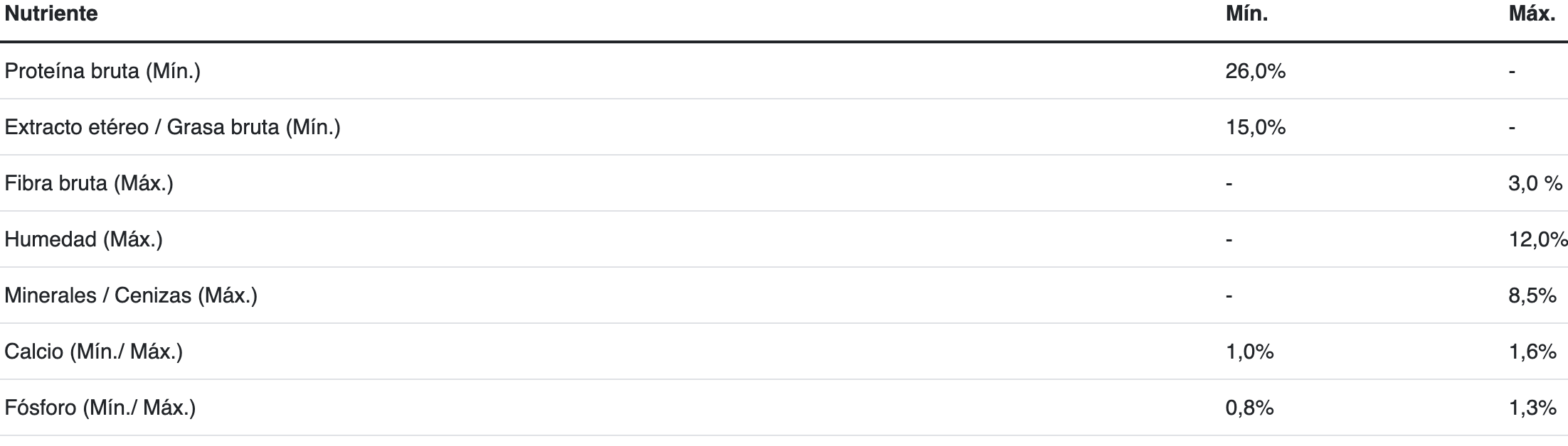 Carne depavocongelada*,maíz, arroz, gluten demaíz,harinadepescado*,aceitede pollo y/o grasa vacuna preservados con tocoferoles (fuentedevitaminaE), hidrolizado(polvoy/olíquido) a base de subproductosde pollo y/ocerdo*,carbonatocálcicoy / fosfatocálcico, aceitedepescadoy / oharina de alga (Schizochytriumsp.), pulpaderemolacha, sal, inulina, clorurodepotasio, zeolita, suplemento vitamínicoantioxidante (A, D3, E, K3, B1, B2, B3, B5, B6, B7, B9, B12, BHT), suplementosminerales , pirofosfatotetrasódico, sorbatodepotasio, clorurodecolina, L-lisina, levaduraseca(Saccharomyces cerevisiaessp.), ácidoascórbico (fuentedevitamina C), probiótico (Bacillus coagulans), DL-metionina, L-triptófano.
