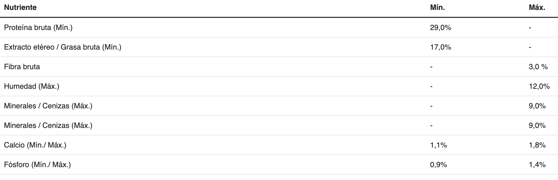 Carne depavocongelada*,maíz, arroz, gluten demaíz,harina de pescado*,aceite de pollo y/o grasa vacuna preservados con tocoferoles (fuentedevitaminaE), hidrolizado(polvoy/olíquido) a base de subproductosde pollo y/ocerdo*,carbonatocálcicoy / fosfatocálcico, aceitedepescadoy / oharina de alga (Schizochytriumsp.), pulpaderemolacha, sal, inulina, clorurodepotasio, zeolita, suplemento vitamínicoantioxidante (A, D3, E, K3, B1, B2, B3, B5, B6, B7, B9, B12, BHT), suplementosminerales , pirofosfatotetrasódico, sorbatodepotasio, clorurodecolina, L-lisina, levaduraseca(Saccharomyces cerevisiaessp.), ácidoascórbico (fuentedevitamina C), probiótico (Bacillus coagulans), DL-metionina, L-triptófano.