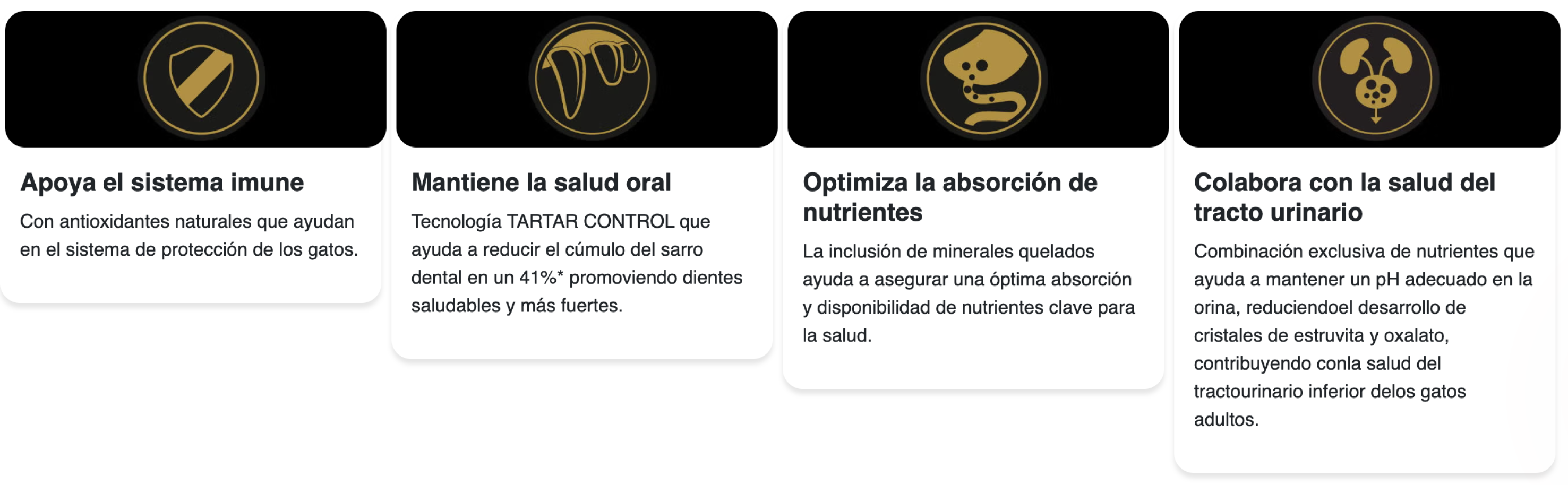 Agua suficiente para proceso, carne de pollo, gluten de trigo, hígado de cerdo, carne de atún, vísceras de cerdo, arroz salvaje, almidón de maíz modificado, sabores artificiales y naturales, sal, concentrado proteico de soya, fosfato tricálcico, cloruro de potasio, colorantes (dióxido de titanio, óxido de hierro), taurina, cloruro de colina, suplemento de vitamina E, mononitrato de tiamina, sulfato de zinc, sulfato ferroso, niacina, pantotenato de calcio, suplemento de vitamina A, complejo sódico de bisulfito de menadiona (fuente de actividad de vitamina K), sulfato de cobre, sulfato de manganeso, hidrocloruro de piridoxina, suplemento de riboflavina, suplemento de vitamina B12, biotina, ácido fólico, suplemento de vitamina D3, ioduro de potasio.