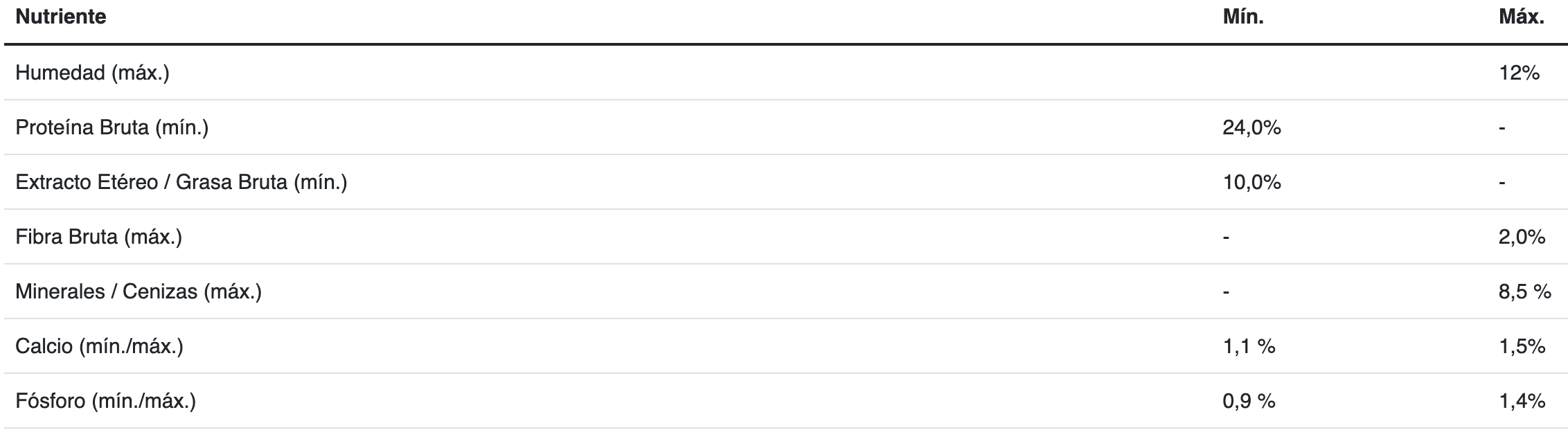 Arroz, maíz, gluten de maíz, harina de subproductos de pollo, aceite de pollo y/o grasa vacuna preservados con tocoferoles (fuente de vitamina E), carbonato de calcio y/o fosfato de calcio, carne de pollo congelada, aceite de coco, bicarbonato de sodio, cloruro de potasio, hidrolizado (polvo y/o líquido) a base de subproductos de pollo y/o cerdo, levadura seca (Saccharomyces cerevisiae), aceite de pescado y/o harina de alga (Schizochytrium sp.), suplemento vitamínico antioxidante (A, D3, E, K3, B1, B2, B3, B5, B6, B7, B9, B12, BHT), inulina y/o fructooligosacáridos y/o pared celular de levadura (fuente natural de manano-oligosacáridos y betaglucanos), L-lisina, sal, pirofosfato tetrasódico, sorbato de potasio, aceite de girasol, suplementos minerales [(sulfatos: zinc, hierro, manganeso, cobre), (proteinatos y/o glicinatos: zinc, hierro, manganeso, cobre, selenio), yodato de calcio, selenito de sodio], cloruro de colina, calostro bovino en polvo (fuente natural de anticuerpos), DL-metionina, L-treonina, ácido ascórbico (fuente de vitamina C), L-triptófano.